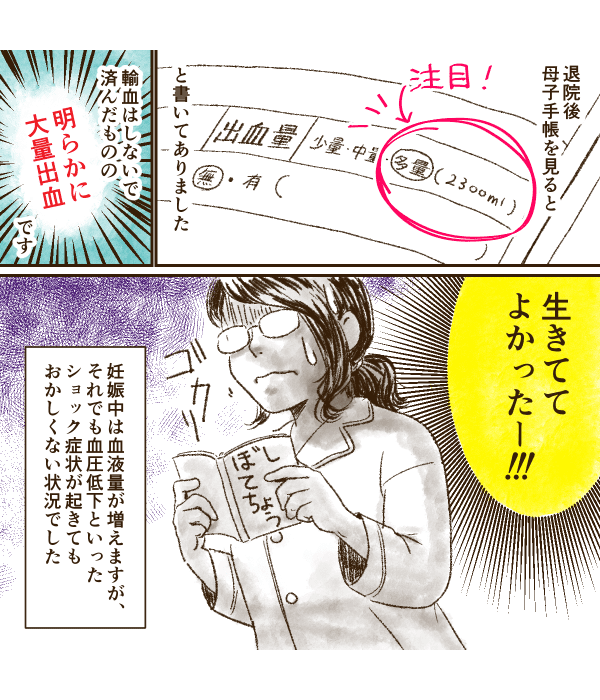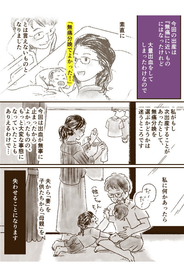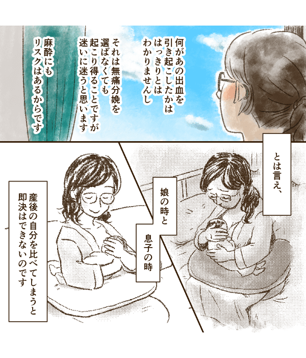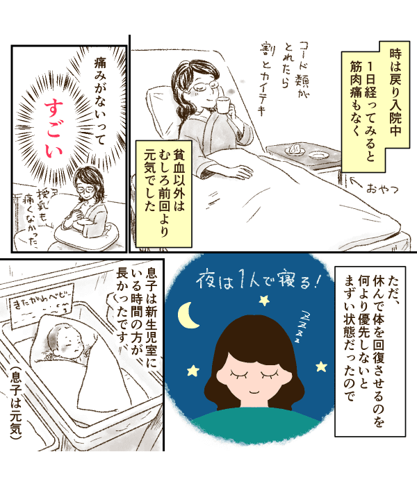 いろいろ考えて、2回目の出産も無痛分娩を選択しました。息子は無事に生まれたのですが、分娩後は出血が止まらず……。何が出血の原因かわかりませんでしたが、お医者さんたちの処置で、なんとか出血は落ち着いたのでした。