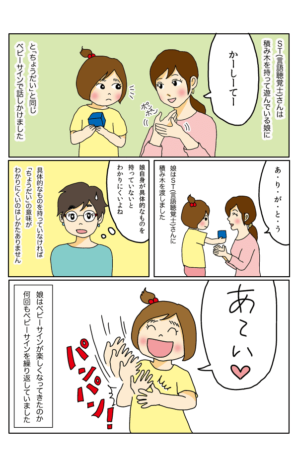 そう言いながらST(言語聴覚士)さんは積み木を持って遊んでいる娘に「かーしーてー」と「ちょうだい」と同じベビーサインで話しかけました。