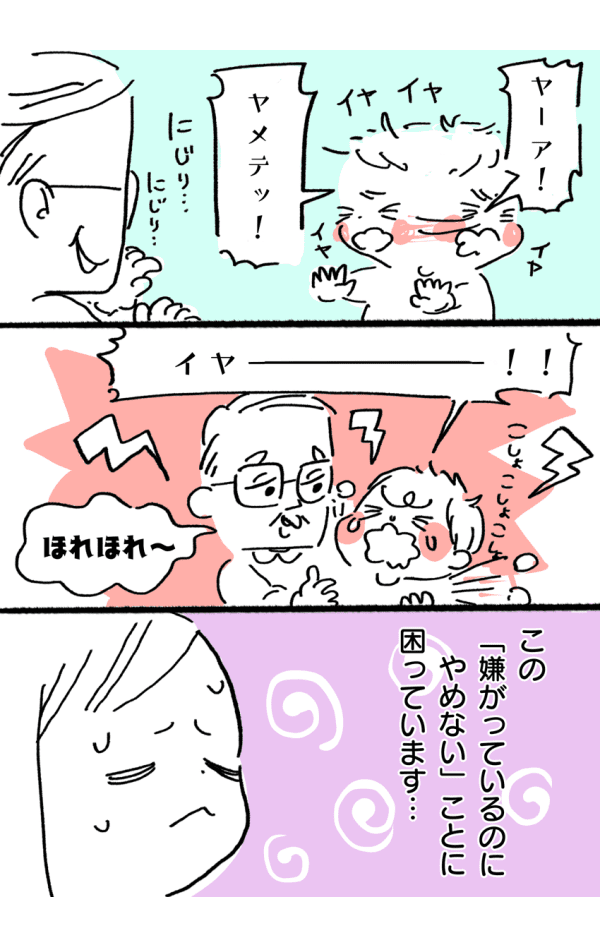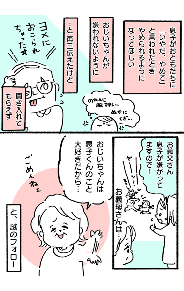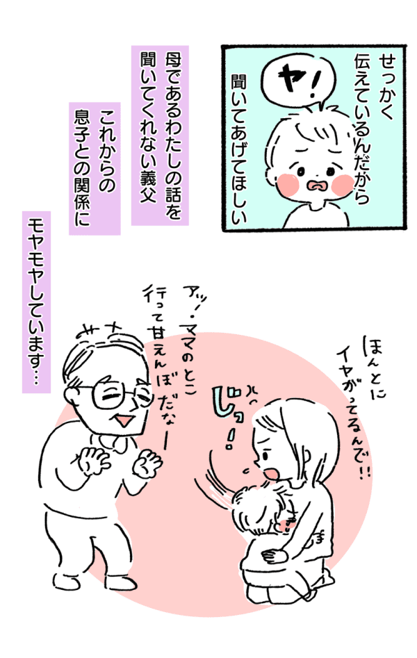 夫の両親と同居しています。おじいちゃんおばあちゃんがそばにいて、何かあったら手を差し伸べてくれる環境はとてもありがたいのですが、一方で同居ならではの悩みも尽きません。こんな場面を目にするたびになんともいえないモヤモヤに包まれる私……。