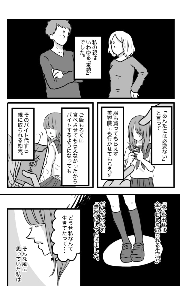 人生で辛い経験が続くと、どこかの時点で自分の人生そのものを諦めてしまいたくなります。「どうせ私の人生なんてこんなものだ……」と。親の存在は変えることができないし、心の傷はこれからも折に触れて疼き、私を苦しめることもあるかもしれません。だけど……。