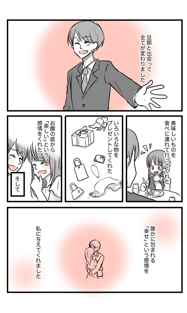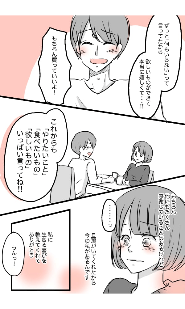 あのとき人生のすべてを放り出さなくてよかった。幸せになりたいと思う気持ちを諦めなくてよかった。出会う人によって、人生は大きく変わることもあるのですね。私に生きる喜びを与えてくれた旦那さんを、これからも大切にしていきたいと思います。