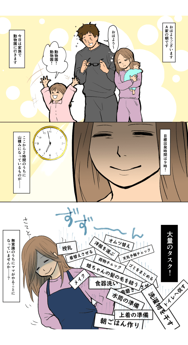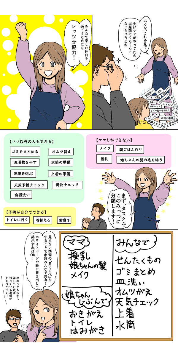同時進行で家族で分担してタスクを消化していけば、準備にかかる時間は半減します。その分、お出かけの楽しい時間は増えるのです。
